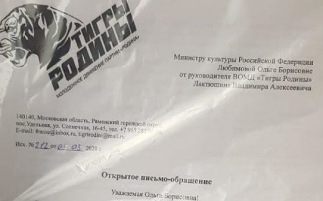 А молодежное крыло партии, движение "ТИГРЫ РОДИНЫ", пикетировало Министерство культуры РФ, а также передало открытое обращение к главе ведомства.