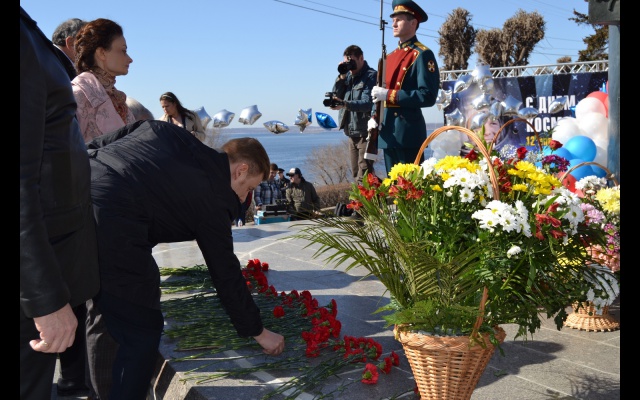 По традиции, были возложены цветы к подножию памятника Юрия Гагарина.