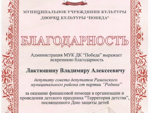 Коллектив Дворца Культуры "Победа" благодарит за финансовую поддержку и помощь в организации праздника депутата Совета депутатов Раменского района от партии "РОДИНА" Владимира Лактюшина.